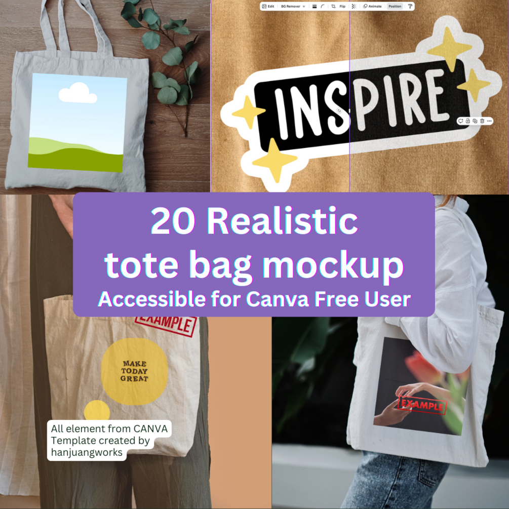 This mockup provides a real tote bag's depth, shadows, and texture, just like a high-quality PSD mockup—but fully editable in Canva, even for free users!
